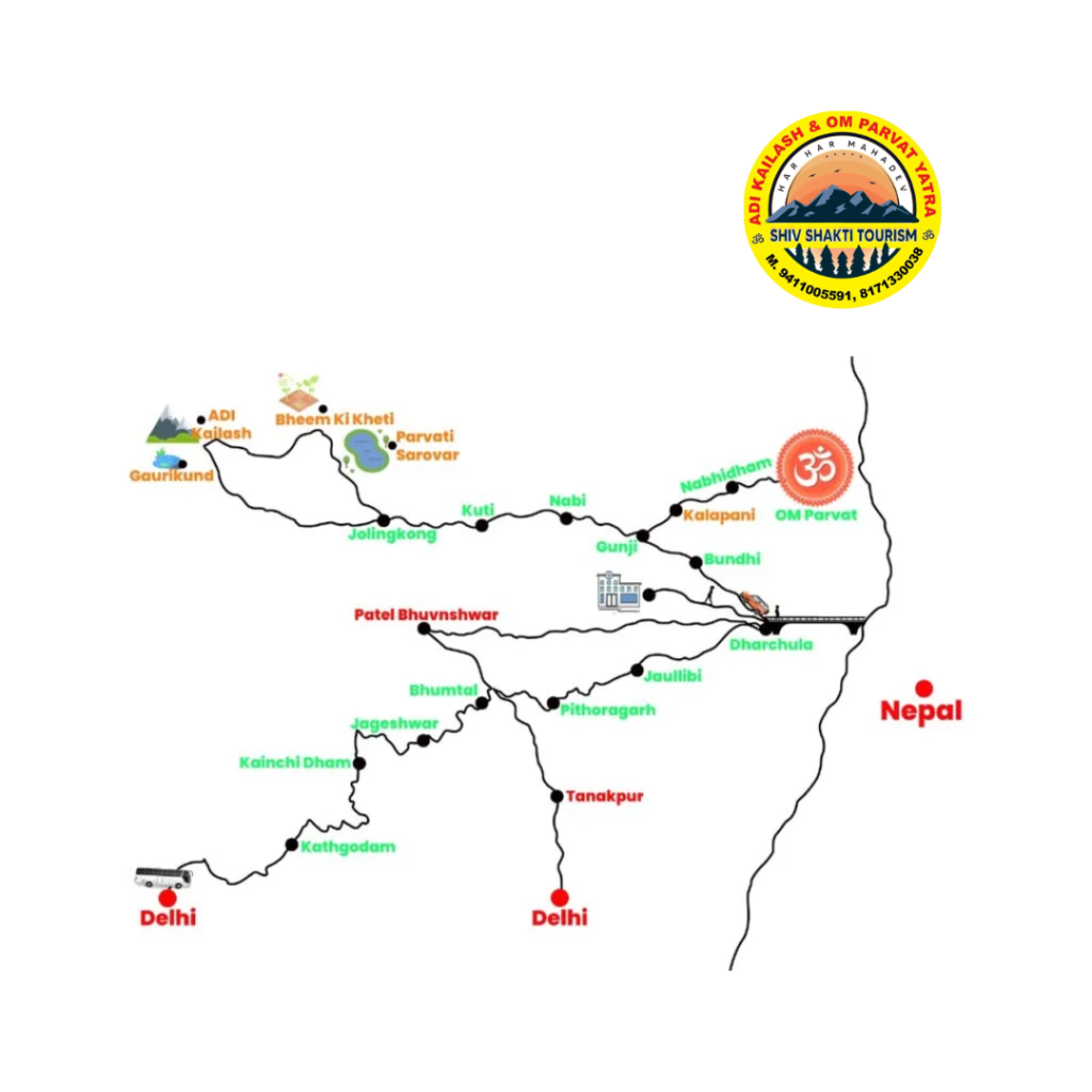 Detailed travel route description with distances, key checkpoints, and how the Adi Kailash & Om Parvat Yatra route flows — ideal for understanding or creating your own map itinerary